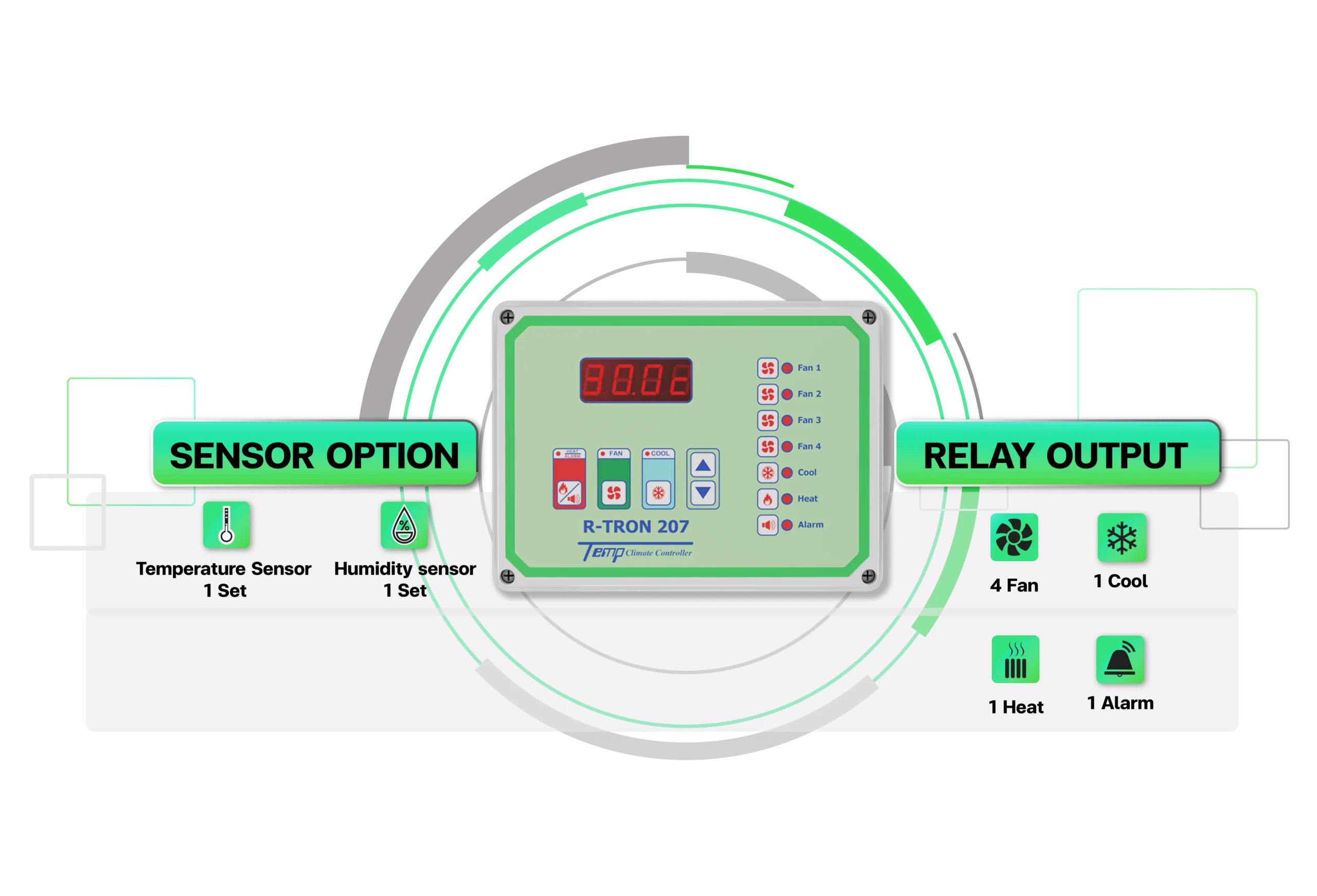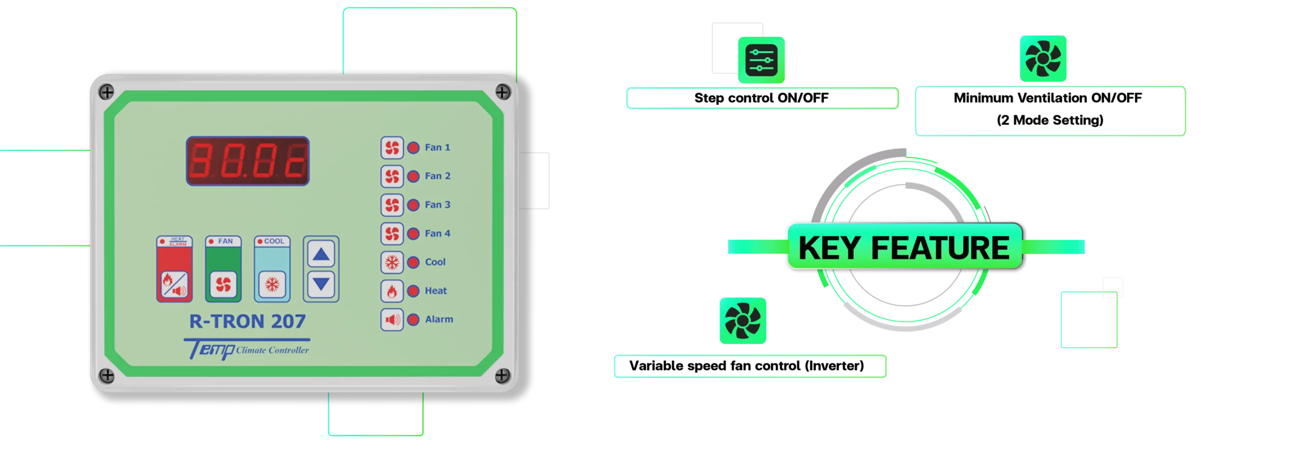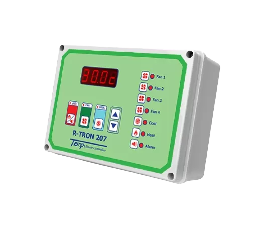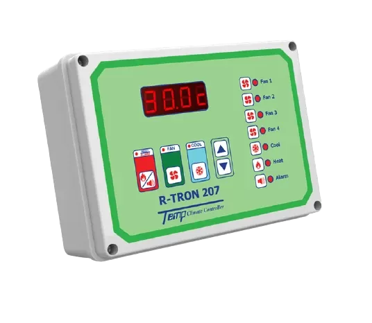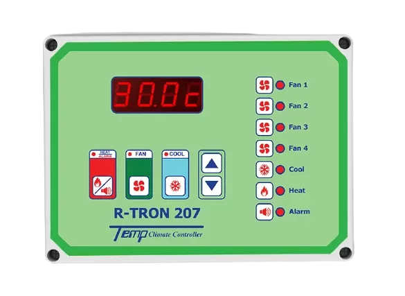 Temp R-Tron series is cost-effective series with advanced features, which available to control 7-20 outputs. This series offers exclusive features for advanced livestock houses control, including fans, cooling pump, heating program, lighting system, and alarm.