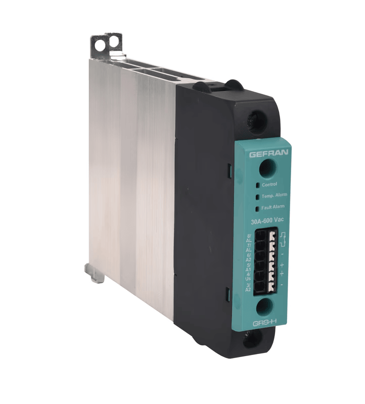 The GRS-H series of Solid State Relay with heat sink, current ratings from 15 to 120 Amperes, voltages up to 660Vac, zero crossing switching (ZC) and in ultra compact sizes is the ideal device for this type of application. The high efficiency heat sinks guarantee for all models the continuous supply of the rated current at a working temperature of 40°C, supported by fans for the 90A and 120A models.