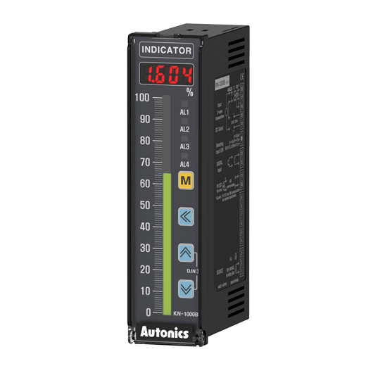 The KN-1000B series bar graph indicators are capable of processing various inputs including thermocouple, RTD, and analog inputs. The series also supports alarm, transmission, and RS485 communication outputs. The LED bar graph and digital display allows users to easily identify measured values.