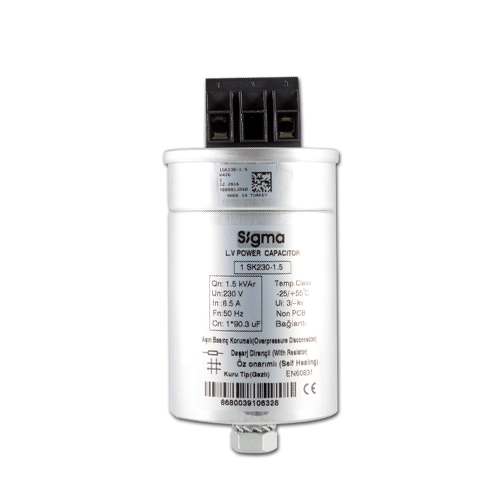 • Sigma Low Voltage Power Capacitors, from 0.25 kVar to 5 kVAr for 230V single-phase capacitors, from 0.5 kVAr to 50 kVAr for 400 V, 415 V, 440 V three-phase capacitors and in addition to 525 V heavy It offers reliable and long-lasting solutions to the reactive power needs of compensation systems from 10 kVAr to 30 kVAr with service capacitors.
